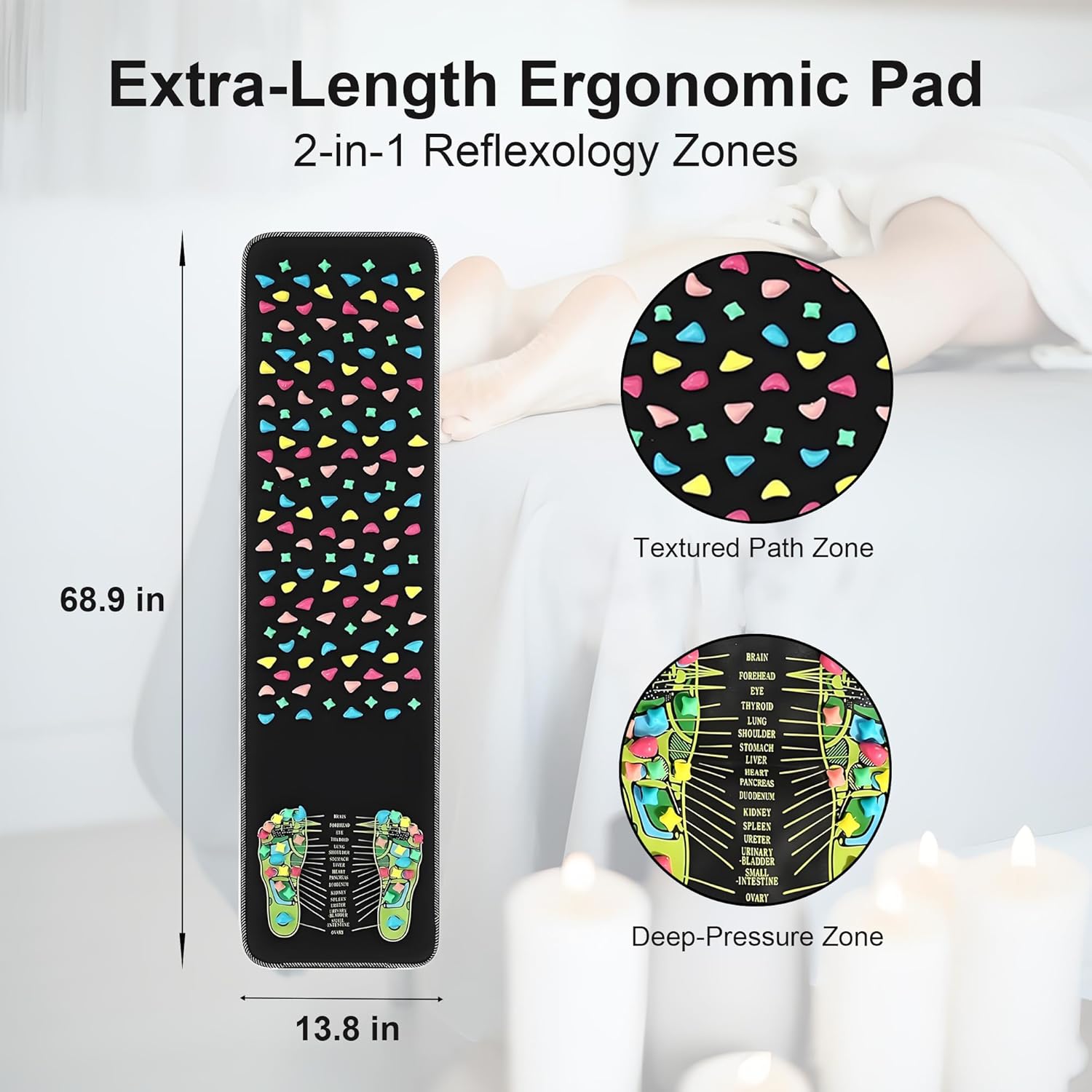 Extra-Length Ergonomic Pad (68.9” x 13.8”):unfold this extra-long massage mat in high-traffic areas: entryways, under desks, or hallways. The non-slip base grips hardwood/tile like a reflexology mat for feet – no sliding during use!