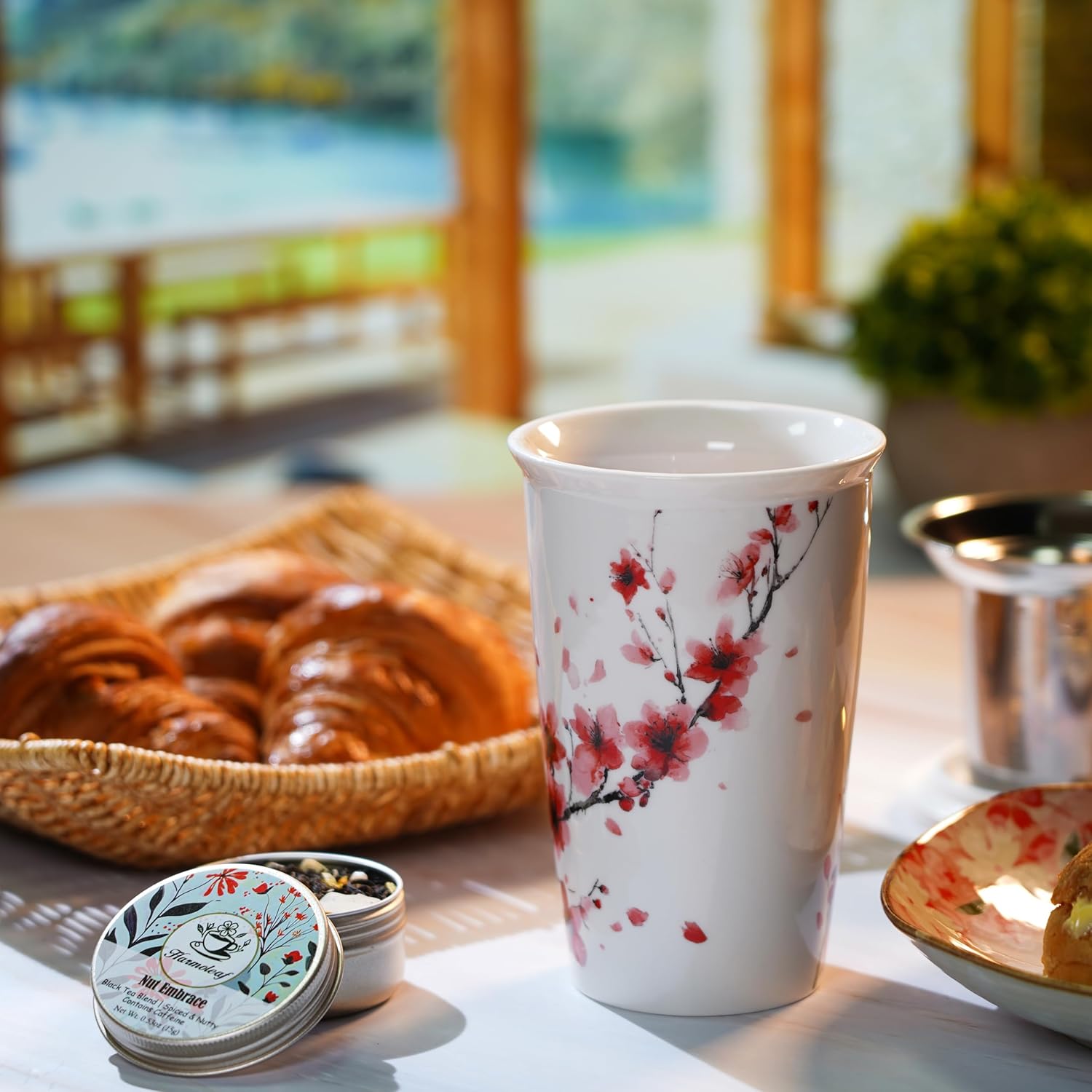 Insulated Ceramic Mug with Cherry Blossom Art6 Loose Leaf Herbal Teas: Tropical Sunset, Moonlit Whispers, Nut Embrace, Jasmine Tale, Rose Kiss, Velvet CitrusStainless Steel Infuser – mess-free & easy to cleanGolden Stirring Spoon – practical eleganceMultifunctional Lid – also serves as drip tray
