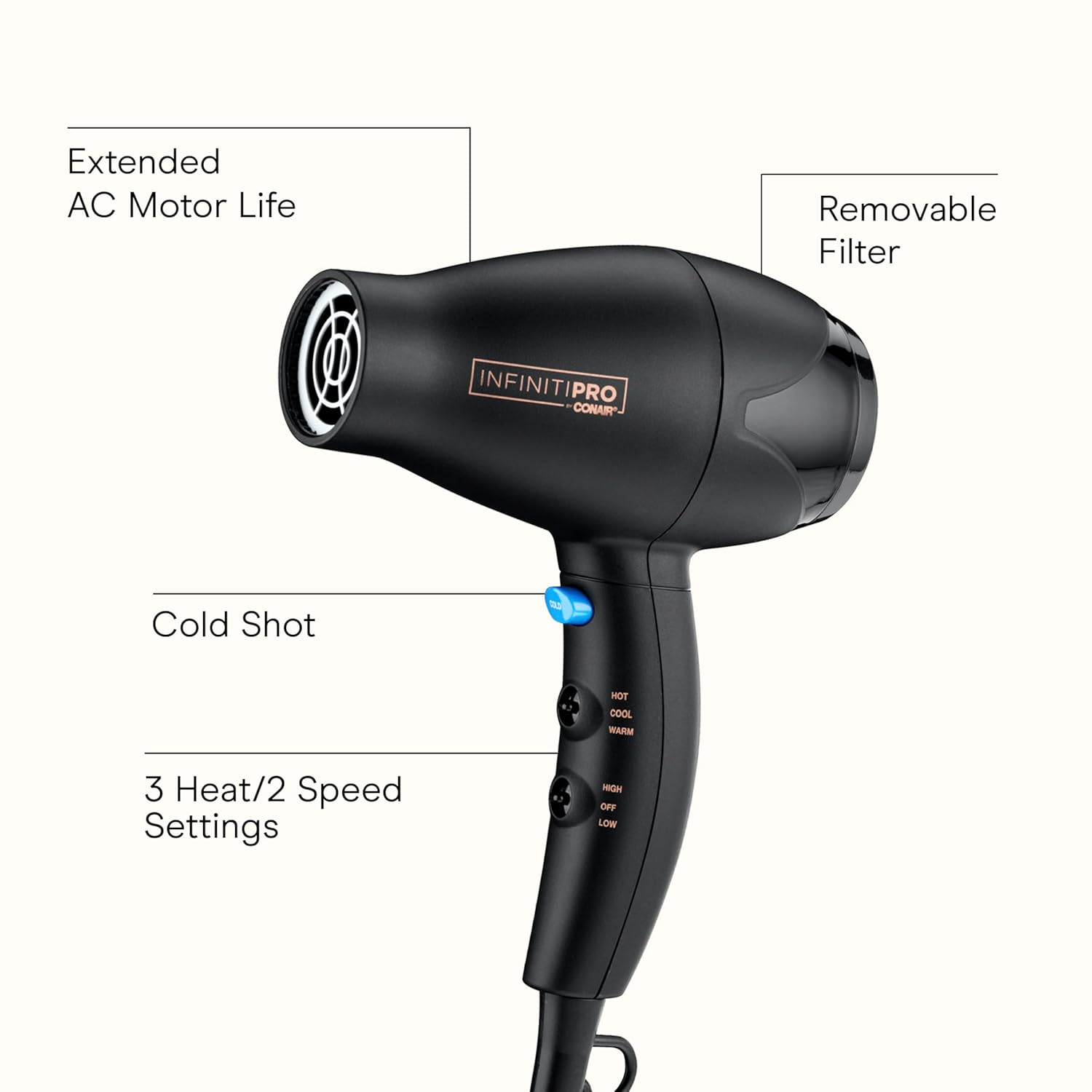 ADVANCED DESIGN: The powerful AC motor delivers up to 50% faster drying time and 3x longer hair dryer life, compared to our other DC motor dryers. Includes 3 heat/2 speed settings and a cold shot button to lock in curls, waves, and style. Removable filter prevents lint buildup and hang ring provides easy access and storage.