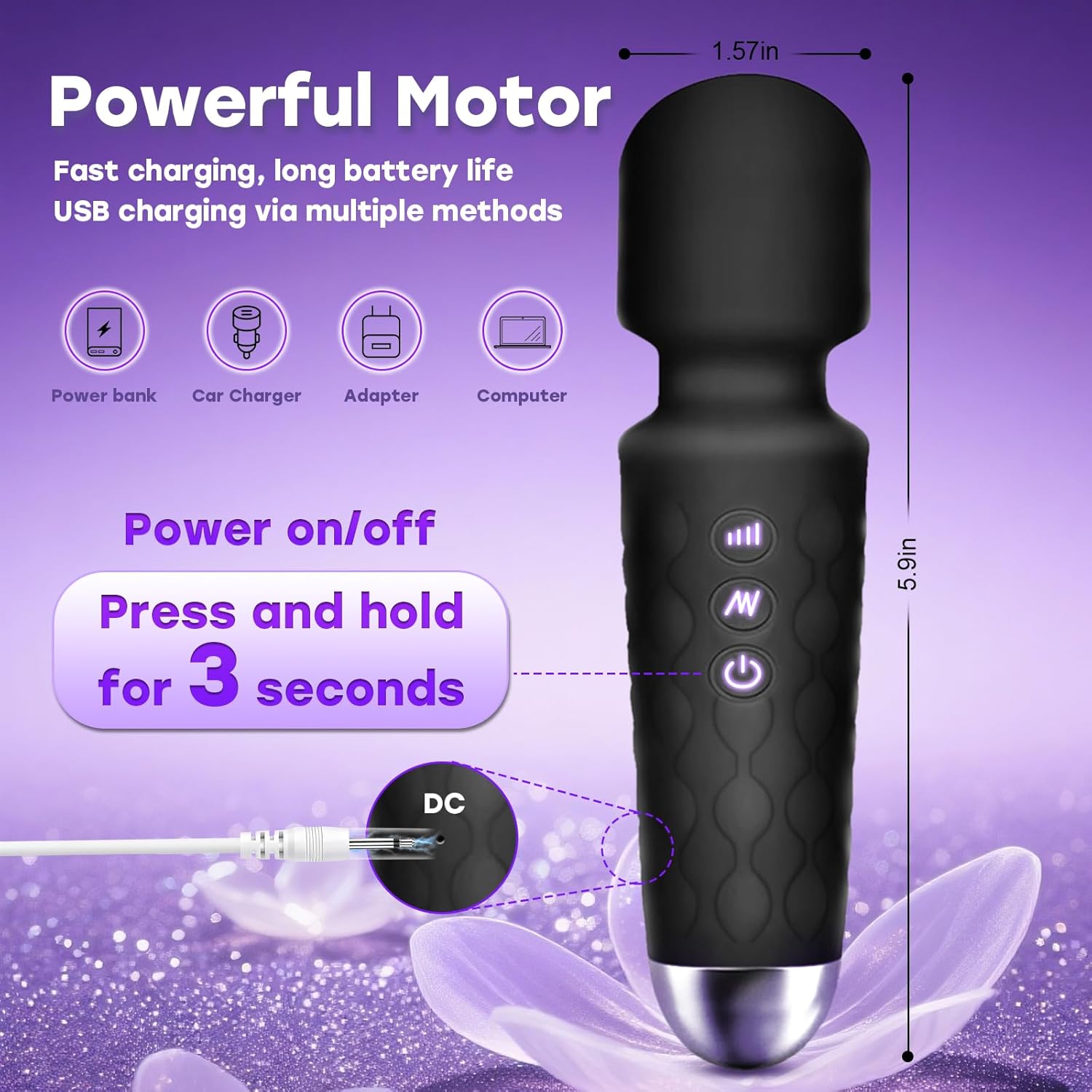 A: The charging port is discreetly designed for both aesthetics and waterproofing—it’s located at the rear bottom (not the base) of the massager. This prevents water ingress during use or cleaning. Simply insert the charger gently when charging.